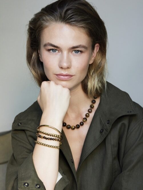 Armbandje van Ellen Beekmans met gemstone balletjes van tijgeroog. De diameter van de balletjes is 5mm. Aan het armbandje zit een logomuntje. Leuk te combineren met het armbandje met gouden balletjes.