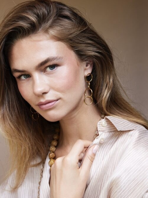 Stijlvolle oorstekers van Ellen Beekmans met met vier in elkaar gehaakte open cirkels. De oorstekers hebben een lengte van 7 cm en diameter van 2 cm. Verguld op long-lasting stainless steel.
