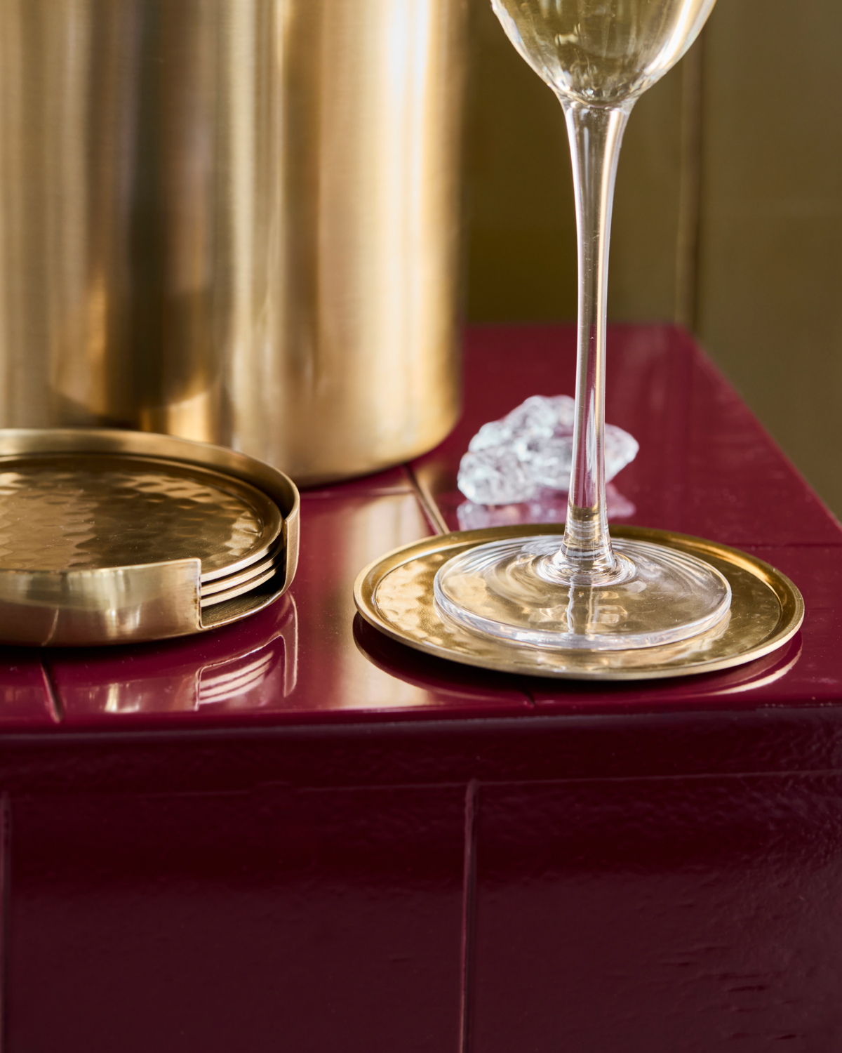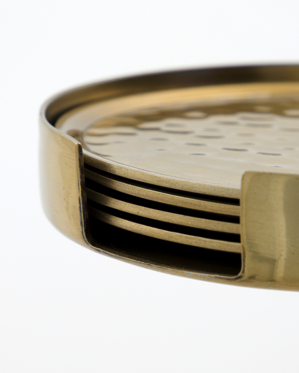 Set van 5 goudkleurige coasters van House Doctor. Een elegante onderzetter voor dagelijks gebruik in een handige houder! h: 1.9 cm, d: 10.5 cm d: 10 cm Materiaal: aluminium
