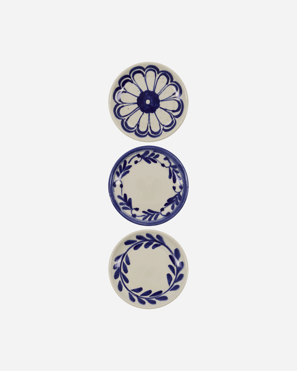 Deze leuke set van 3 handbeschilderde aardewerken bordjes is ideaal voor het serveren van kleine hapjes en geeft een zomerse touch aan je borreltafel! Uitgevoerd in tijdloos blauw wit. h: 1.5 cm, d: 13 cm